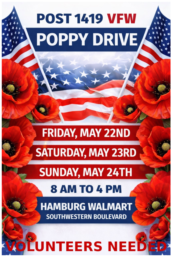 We are looking for donations to Buddy Poppy Drive. The money can only be used for veterans in need none of it can be used for anything else. Please bring or write a check to 2985 Lakeview Rd In Hamburg New York zip 14075. Any amount is appreciated. Donation drive ends May 24th 2026.